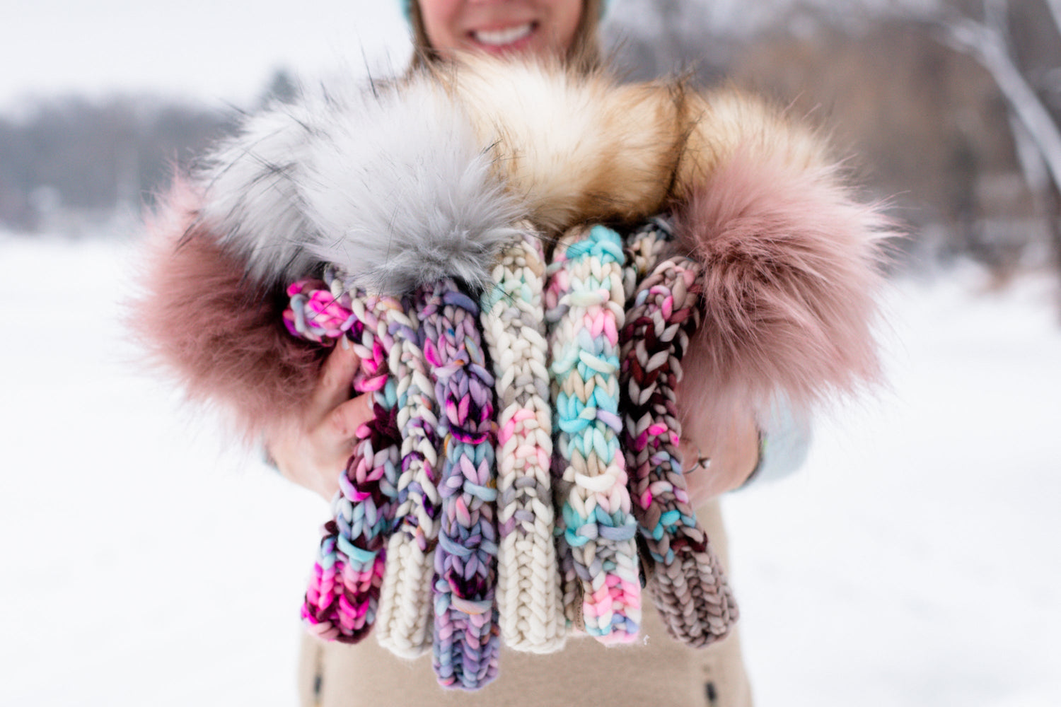 Our hats and cowls are hand knit with care, using only the highest quality mulesing-free Peruvian and merino wool. Natural fibers are warm and breathable, allowing you to spend more time comfortably outdoors. Our pom poms are handmade with faux fur.
