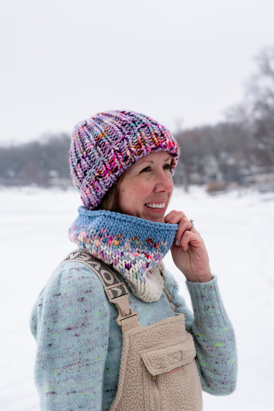 Sold out: check back soonPurple and Blue Merino Wool Fair Isle Hand Knit Cowl