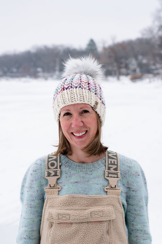 Sold out: check back soonPink Multicolor Merino Wool Knit Hat with Faux Fur Pom Pom - Hand-Dyed Yarn