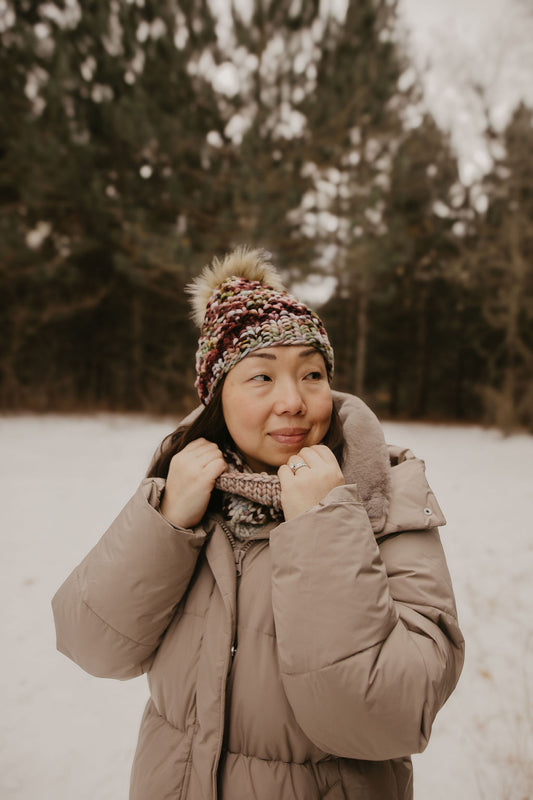 Cranberry and Beige Merino Wool Fair Isle Hand Knit Cowl