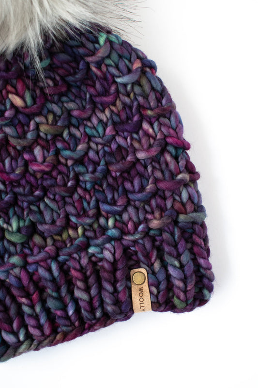 Purple Multi-Color Merino Wool Knit Hat with Faux Fur Pom Pom