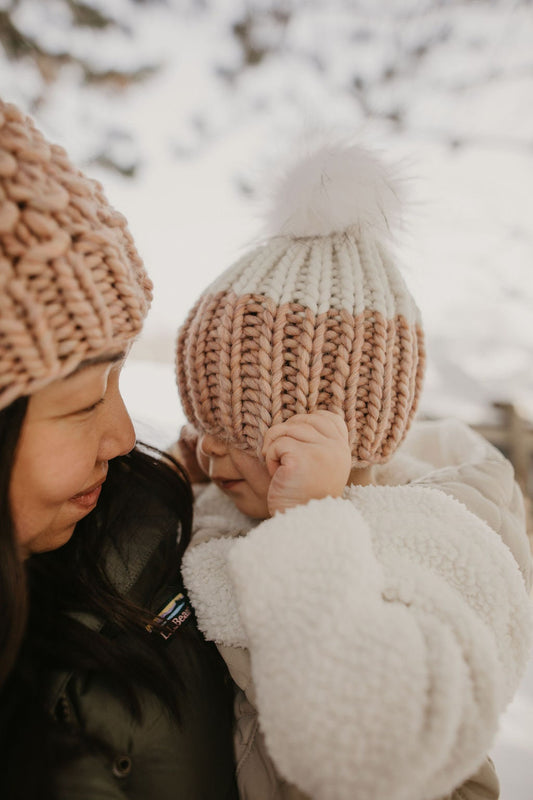Child and Toddler Size Ribbed Knit Colorblock Peruvian Wool Hat with Faux Fur Pom Pom (More Colors Available)