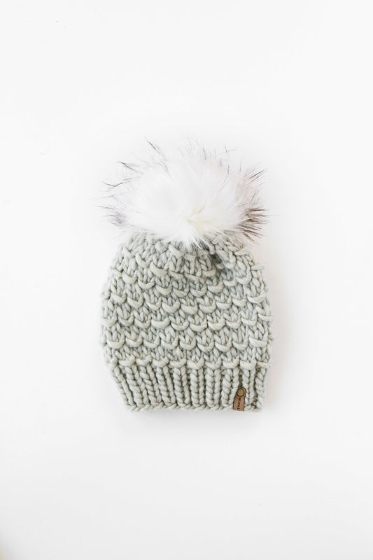 Pearl Gray Merino Wool Knit Hat with Faux Fur Pom Pom