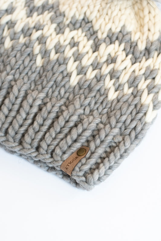 Gray and Ivory Fair Isle Merino Wool Knit Hat with Faux Fur Pom Pom