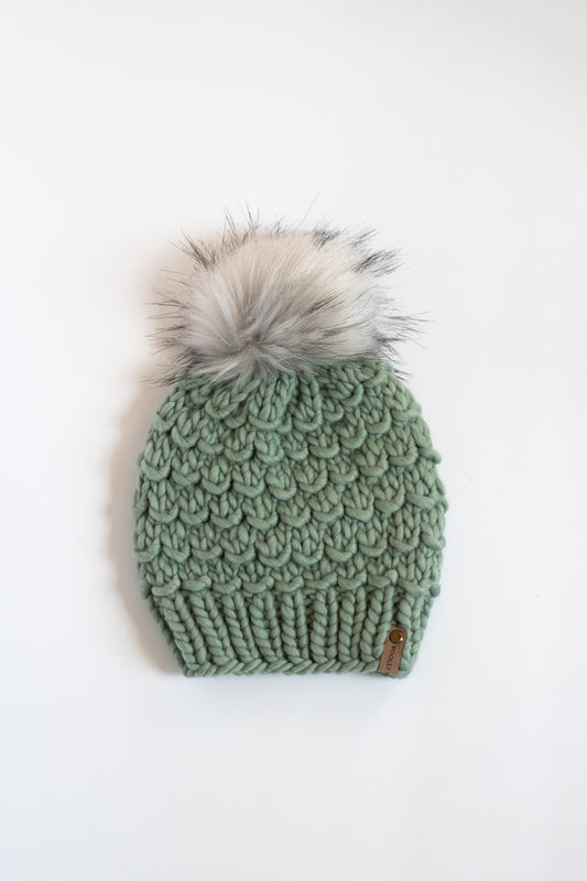 Sage Green Merino Wool Knit Hat with Faux Fur Pom Pom