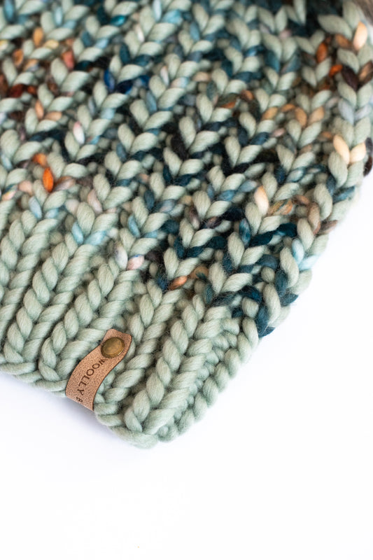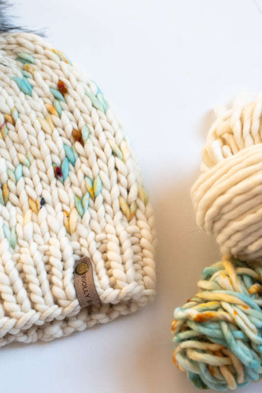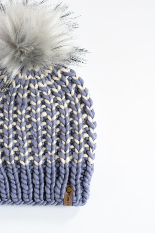 Blue Speckled Merino Wool Knit Hat with Faux Fur Pom Pom - Hand Dyed Yarn