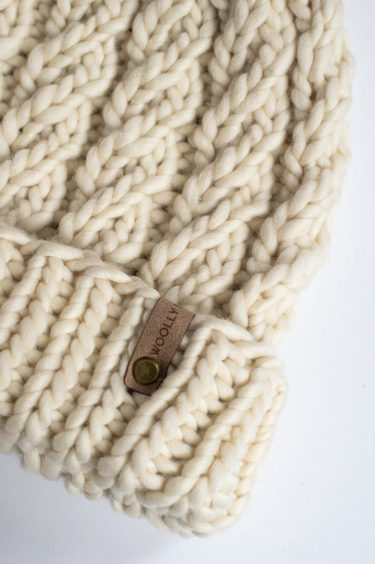 Ivory Merino Wool Knit Hat with Faux Fur Pom Pom