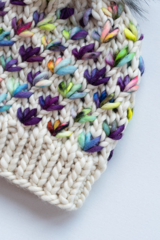 Ivory and Purple Flower Merino Wool Knit Hat with Faux Fur Pom Pom