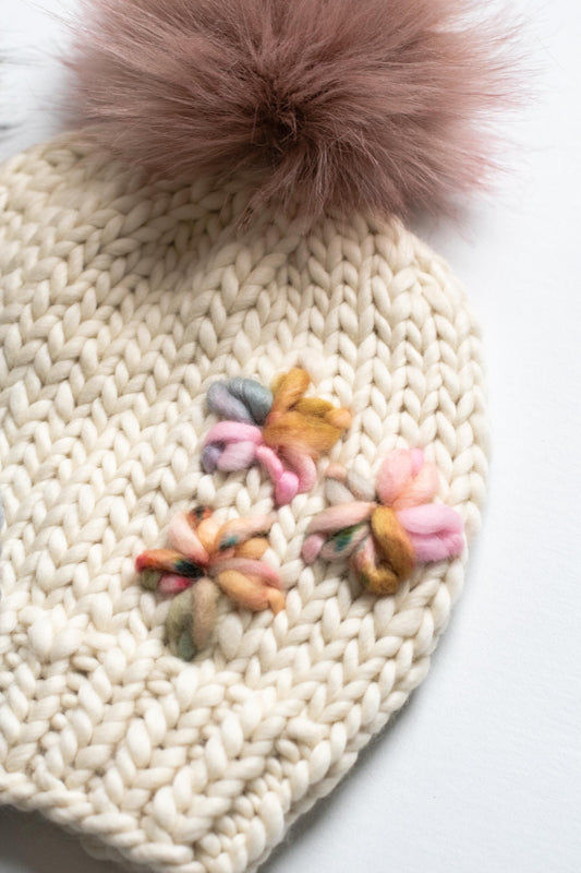 Ivory and Pink Floral Embroidered Merino Wool Hat with Faux Fur Pom Pom