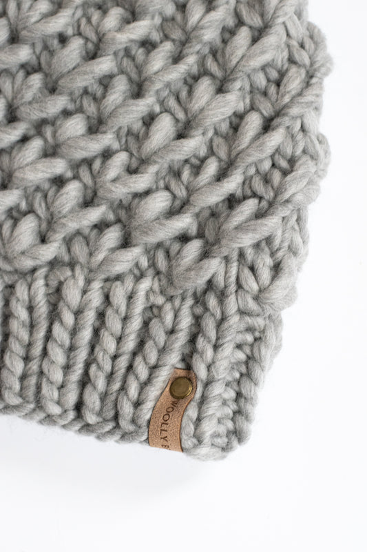 Gray Textured Merino Wool Knit Hat with Faux Fur Pom Pom