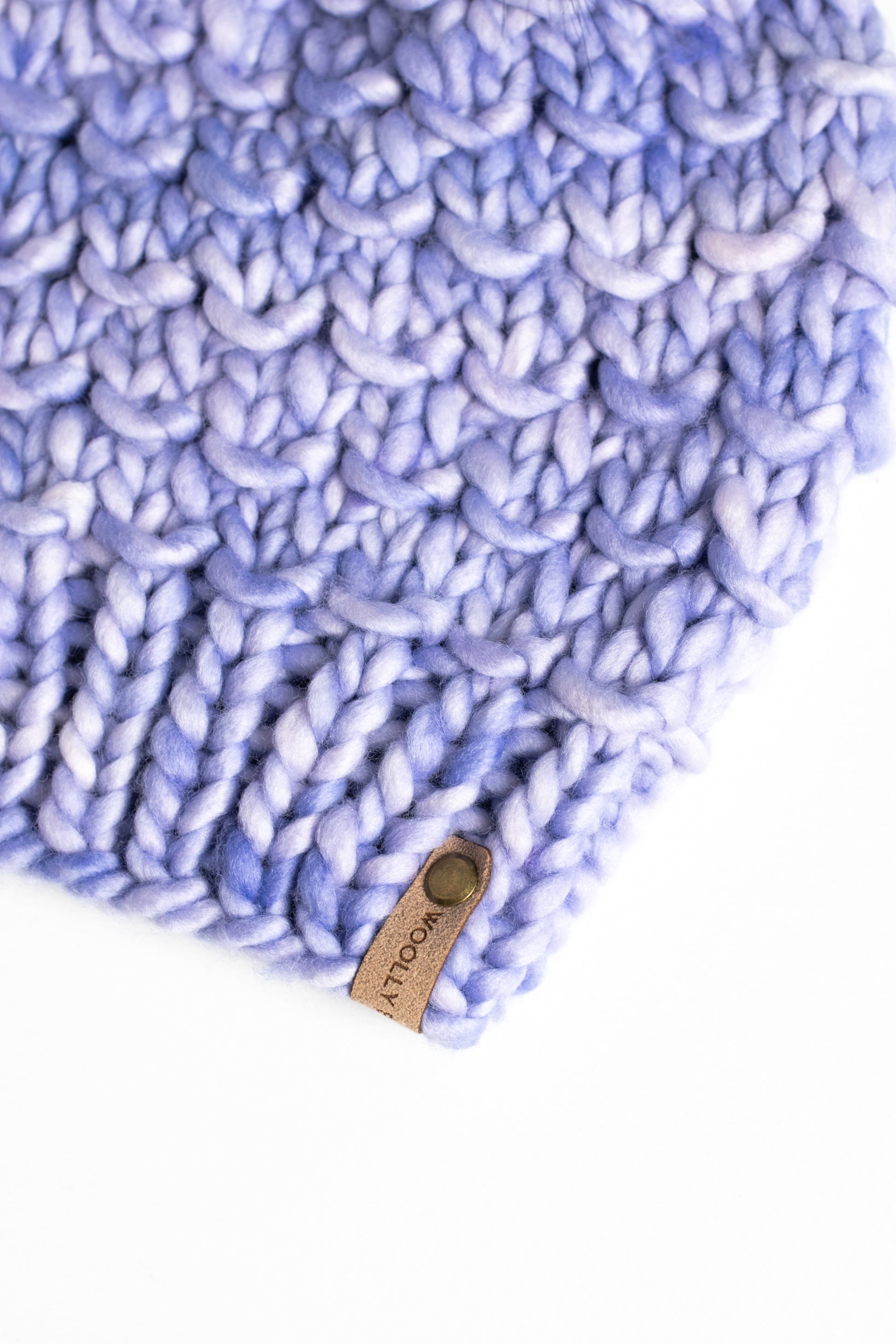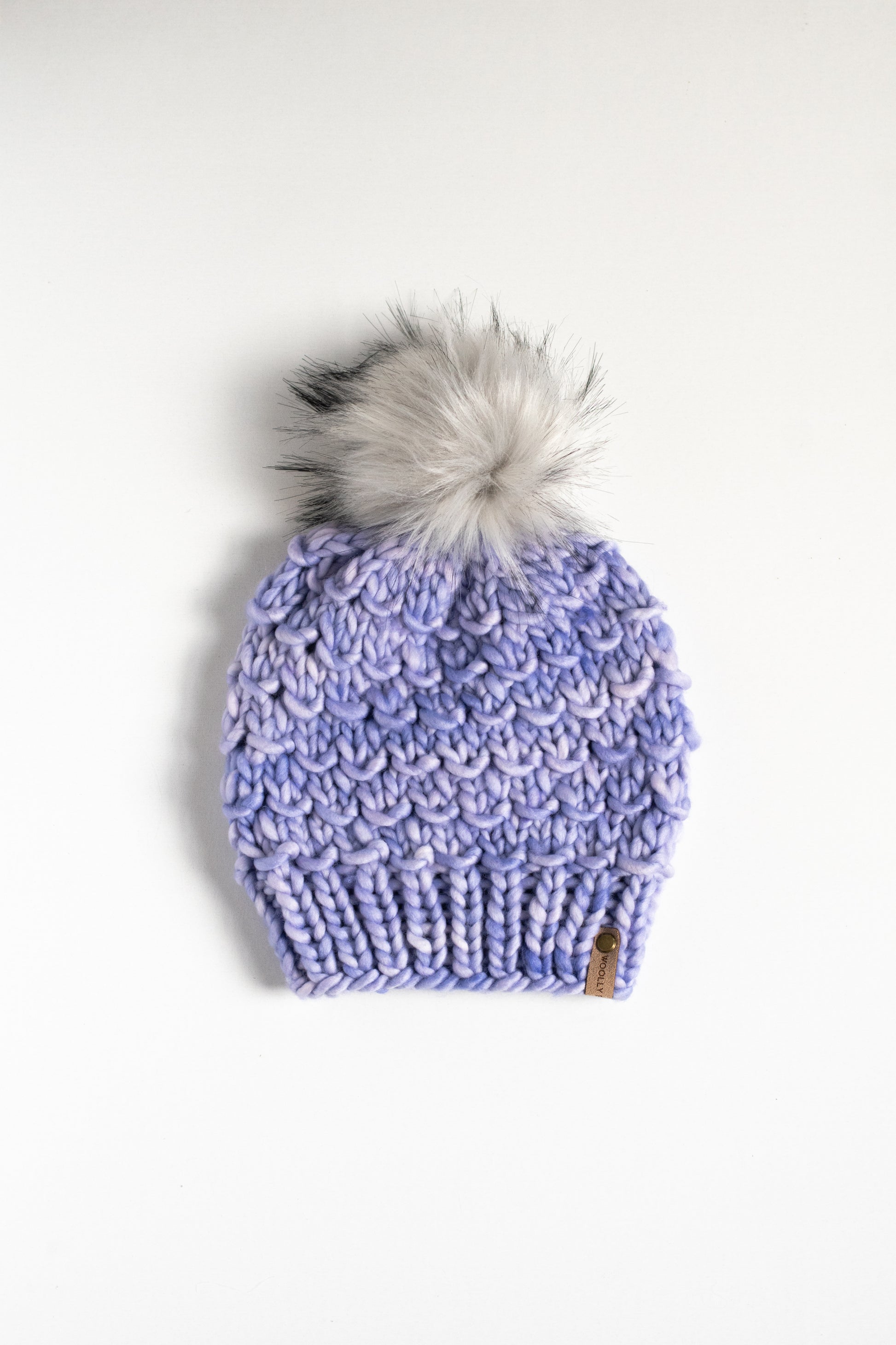 Bright Lavender Merino Wool Knit Hat with Faux Fur Pom Pom - Hand Dyed Yarn