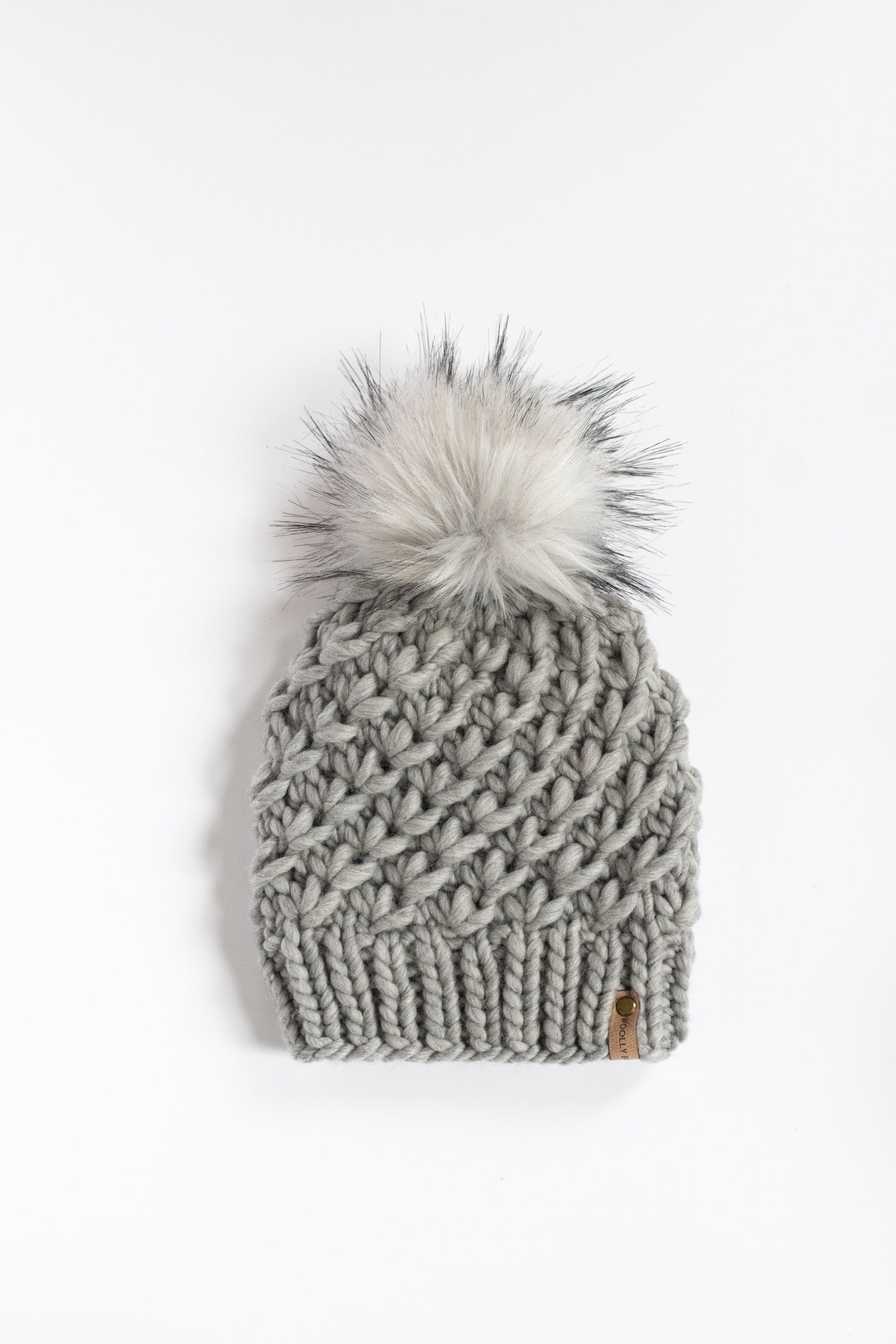 Gray Textured Merino Wool Knit Hat with Faux Fur Pom Pom